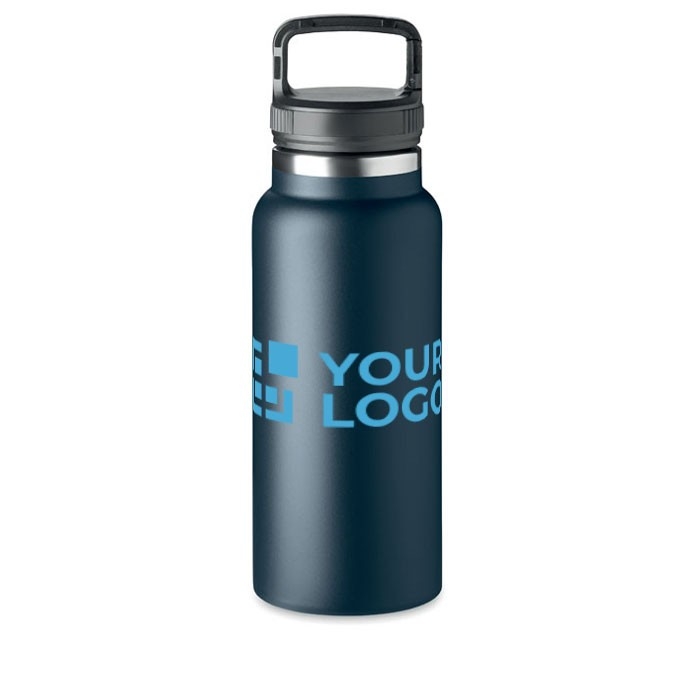 Garrafa em aço inoxidável de parede dupla isolada a vácuo com pega na tampa. Capacidade: 970 ml.