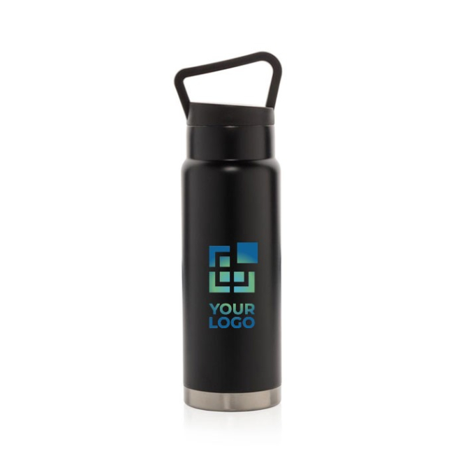 Transporte comodamente estas garrafas promocionais em inox, graças à asa que incluem na tampa, mantendo as bebidas frias ou quentes durante horas.