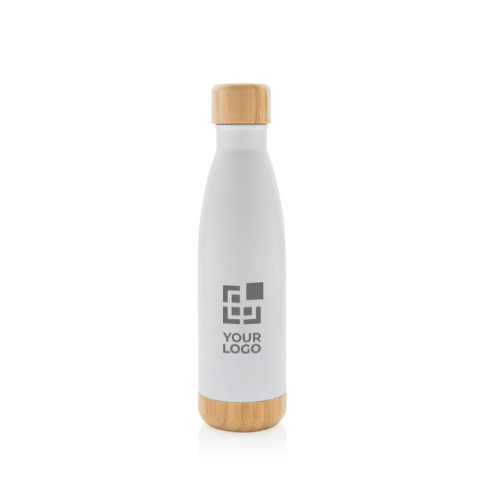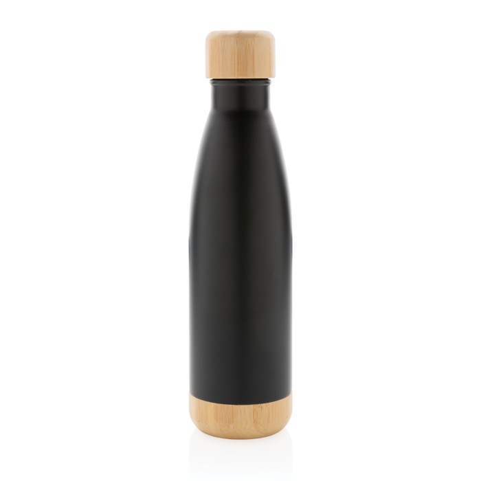Garrafa de aço inox a vácuo. Conta com uma tampa de bambu e um detalhe na parte inferior para lhe dar um toque extra de estilo. Capacidade de 520 ml.