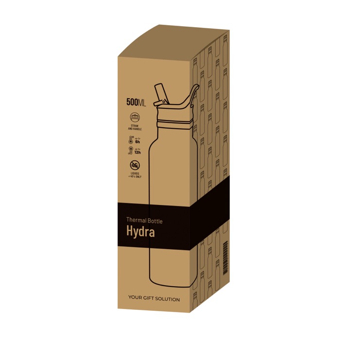 Garrafa térmica de parede dupla de aço inoxidável com revestimento de pó, o que garante resistência e durabilidade e um acabamento estético sofisticado. A tampa hermética de polipropileno, com pega fixa e palhinha dobrável, oferece praticidade e segurança, enquanto a base de EVA proporciona aderência e proteção antideslizante. Com capacidade de 500 ml, é entregue em caixa-oferta kraft, adequada tanto para uso diário como para oferta.