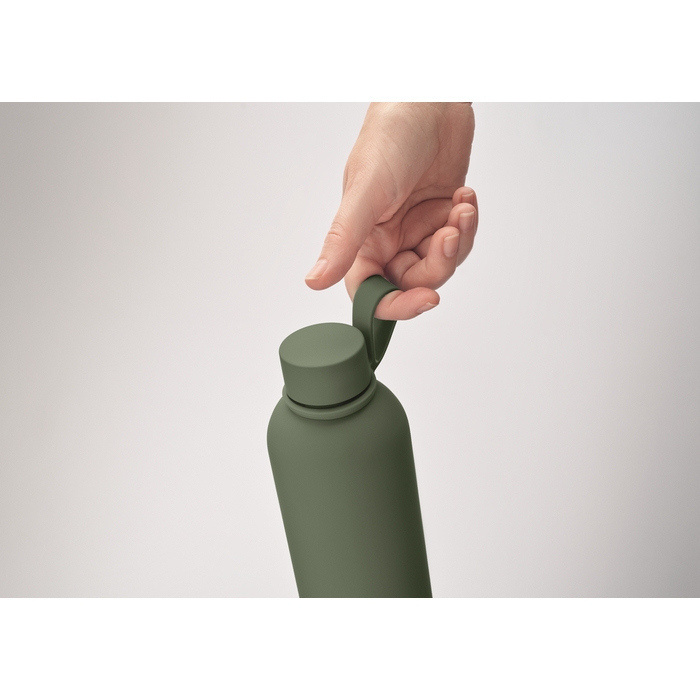 Garrafa de parede dupla isolante a vácuo em aço inoxidável reciclado (90% aço inoxidável reciclado e 10% aço inoxidável) com acabamento em borracha e pega em silicone. Capacidade: 500 ml.