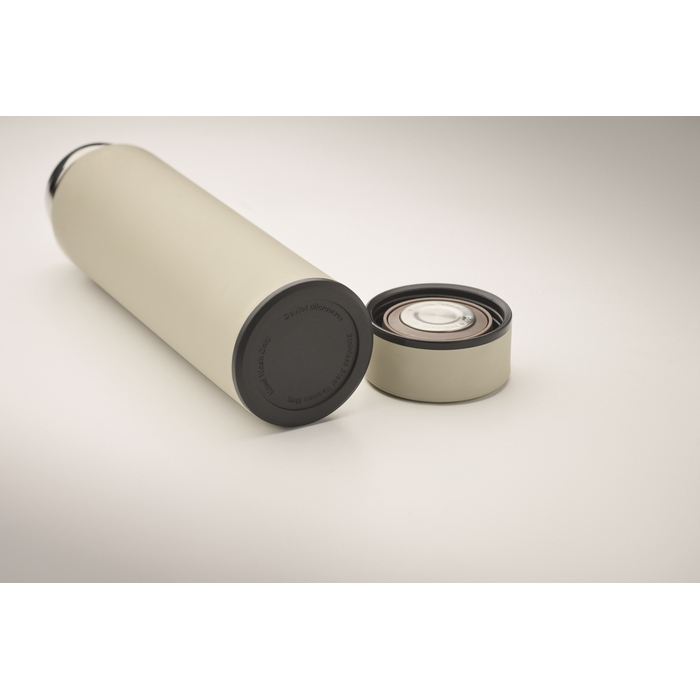 Garrafa isolante a vácuo de parede dupla em aço inoxidável reciclado (90% aço inoxidável reciclado e 10% aço inoxidável) com camada interior de cerâmica. Capacidade: 420 ml.