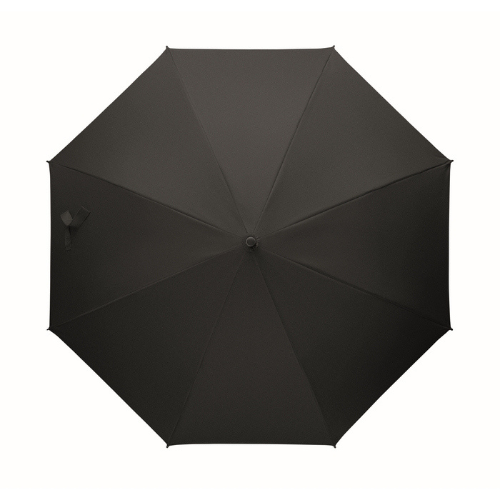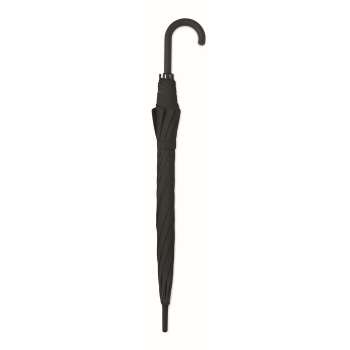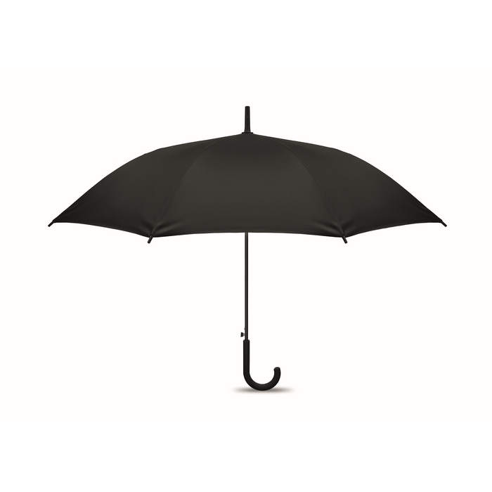 Guarda-chuva de 23'' com abertura automática, estrutura metálica laminada em preto, varetas de fibra de vidro e painéis de tecido pongee 190T. Pontas e parte superior de plástico. Punho curvo de plástico PP com borracha. Fecho manual.