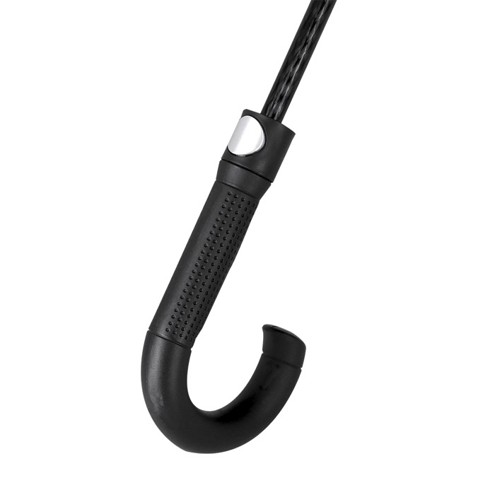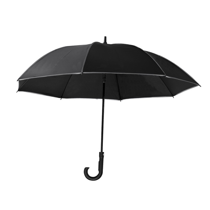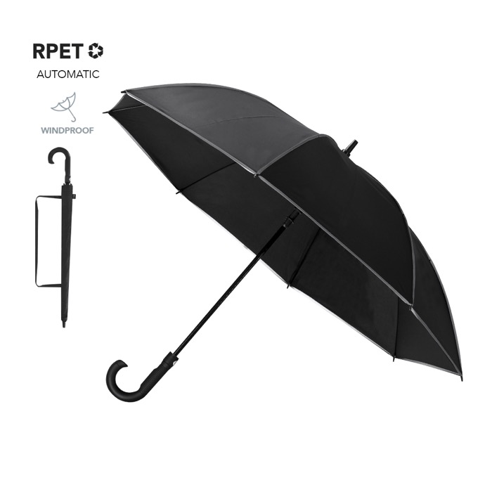 Guarda-chuva antivento de plástico reciclado com design em preto e rebordos refletores para melhorar a visibilidade. Dispõe de 8 painéis e diâmetro de 120 cm, com abertura automática e fecho manual para uso ágil em deslocações diárias. As varetas de fibra de vidro dão-lhe resistência contra rajadas de vento, enquanto o tecido pongee repele a água. Inclui fecho de velcro, punho curvo de plástico e bolsa com fita ajustável para o transportar confortavelmente. Recomendado para ações de branding em eventos e equipas comerciais.