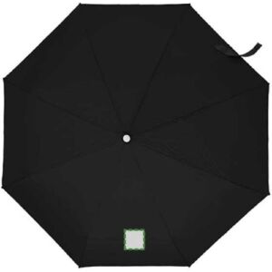 Guarda-chuva dobrável com abertura e fecho automático, fabricado em seda pongee, com armação metálica, reforços em fibra de vidro e pega em plástico. Apresentado em bolsa a condizer.