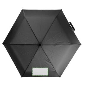 Um guarda-chuva automático dobrável de 27 polegadas com 6 painéis e estrutura de aço. Inclui bolsa, pega com mosquetão e um fecho de velcro com etiqueta rPET.