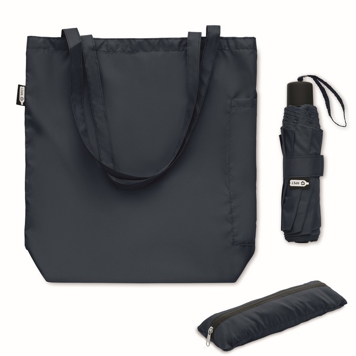Guarda-chuva antivento de 21 polegadas com 3 dobras, abertura e fecho manual de pongee rPET 190T. Inclui saco de compras. Dispõe de um compartimento oculto com fecho de correr para guardar o guarda-chuva e manter o conteúdo do saco seco. Quando o saco não está a ser usado, pode ser enrolado e o compartimento com fecho funciona como capa de guarda-chuva.