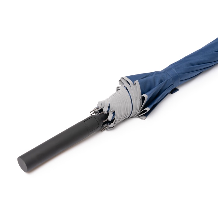 Guarda-chuva em plástico reciclado com tecido pongee 190T e abertura automática através de botão no cabo. Incorpora uma faixa refletora perimetral que melhora a visibilidade nas deslocações e em eventos ao ar livre. As varetas em fibra de vidro oferecem resistência e, juntamente com a cobertura ventilada por painéis, ajudam a reduzir a inversão com rajadas de vento. Inclui fecho de velcro para uma arrumação rápida. Uma opção prática para ações de marca em feiras, receções ou equipas de trabalho.