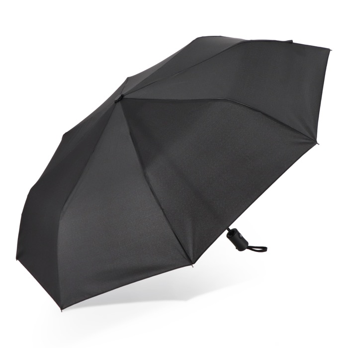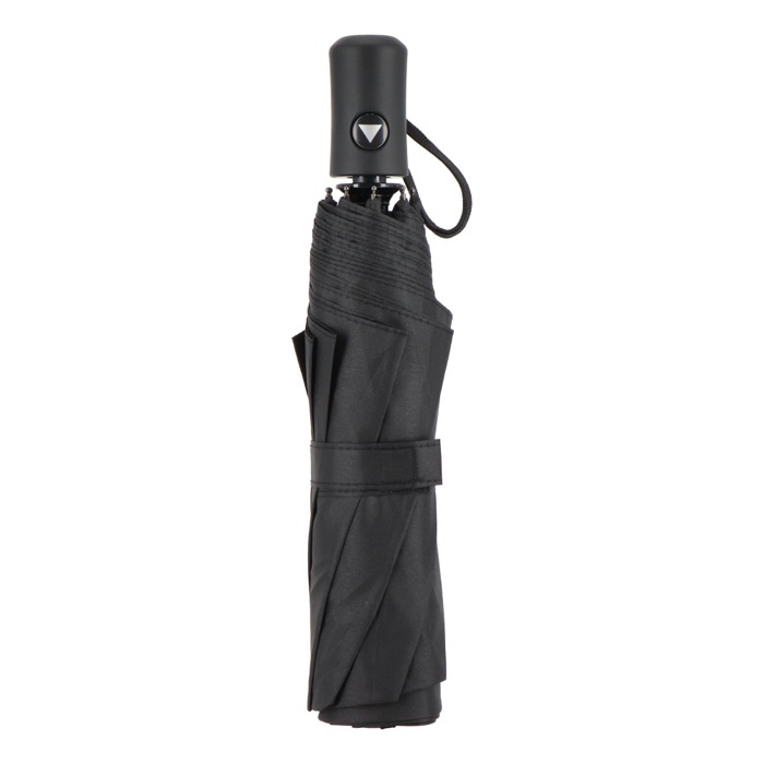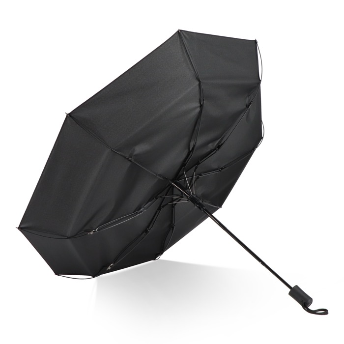 Guarda-chuva dobrável 21,5" com armação de fibra de vidro e capa pongee 190T resistente ao vento. Abertura automática, fecho manual. Inclui bolsa, cordão e punho de ABS para uma pega confortável.