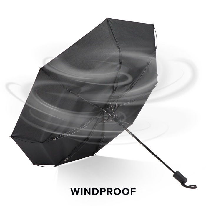 Guarda-chuva dobrável com armação de fibra de vidro e capa resistente ao vento. Abertura automática e promoção garantida mesmo em dias de chuva e frio.