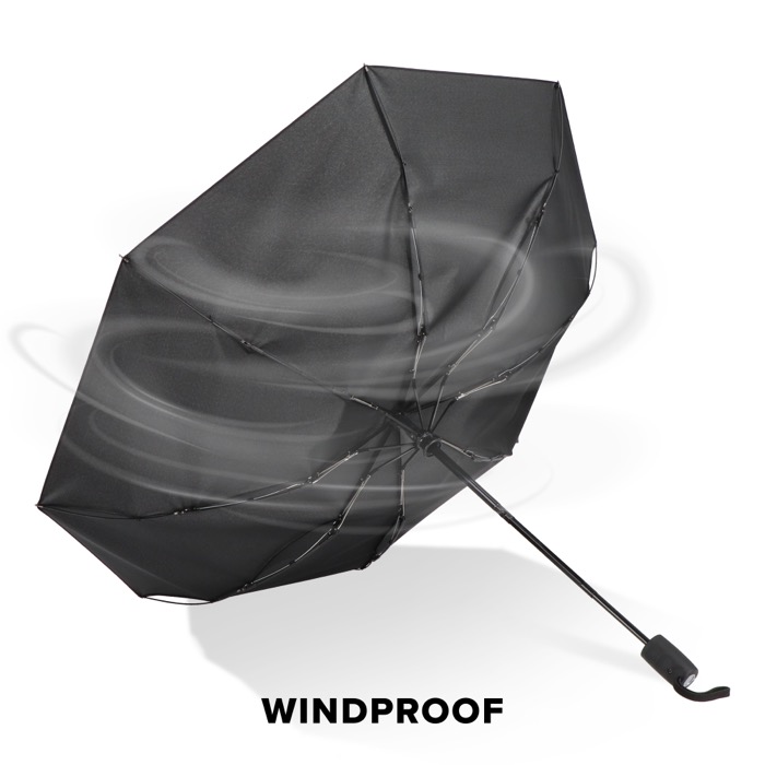 Este guarda-chuva dobrável de 21" foi concebido para aguentar condições de vento com armação duradoura de fibra de vidro e capa de pongee. Dispõe de abertura e fecho automáticos para facilitar a utilização. Inclui uma bolsa para o guardar e cordão atado ao punho para segurança extra ao utilizar. O punho de ABS oferece uma pega confortável.