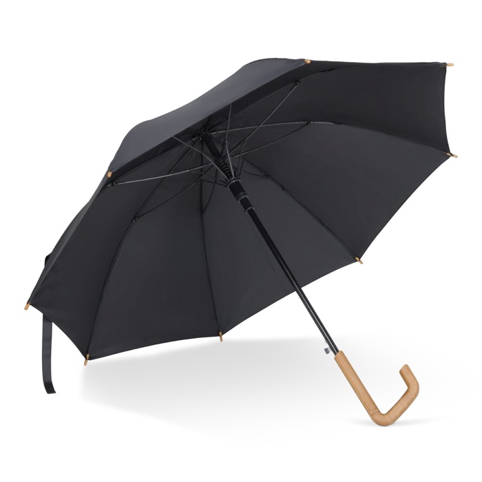 Guarda-chuva de varetas com cabo de madeira distintivo. Estrutura de fibra de vidro resistente a tempestades. Pontas de bambu, eixo de metal e em cor elegante.