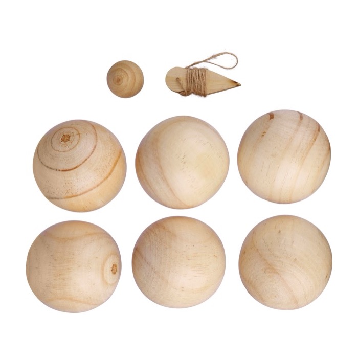 Conjunto de jogo de bolas em madeira, incluindo 6 bolas (7 cm cada) e 1 bola mais pequena (2 cm). Vem com uma corda e é embalado como um conjunto numa bolsa de algodão com cordão. Adequado para 4-6 jogadores e ideal para actividades baseadas na agilidade.