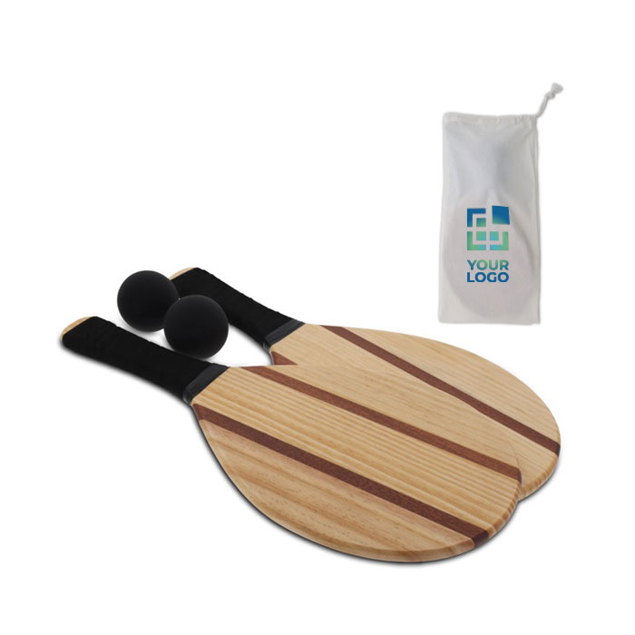 Um elegante jogo de ténis de praia, fabricado em madeira de álamo com cabos de couro vegano para uma aderência mais confortável. Um jogo fácil de aprender e adequado tanto para jovens como para idosos. Inclui duas raquetes e duas bolas de borracha, embaladas num saco de lona que facilita o seu transporte e, tal como as raquetes, é personalizável com o seu logótipo. Este jogo é concebido unicamente para uso em superfícies secas e não para uso na água. O preço do site refere-se à personalização de uma única raquete, se desejar personalizar ambas, deve entrar em contacto com o serviço de apoio ao cliente.