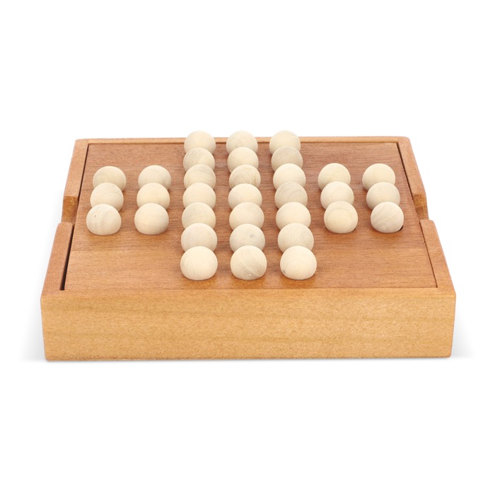 Este jogo Solitário de Tabuleiro de madeira com berlindes oferece um desafio envolvente para jogadores de todos os níveis. Jogue sozinho ou por turnos com outros, planeando estrategicamente como eliminar a maior quantidade de peças possível, saltando uma por cima da outra. A caixa transforma-se engenhosamente de armazenamento em tabuleiro de jogo.