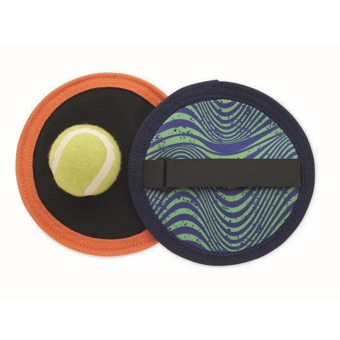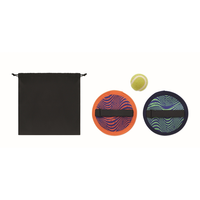 Jogo de apanhar bolas de neopreno para atividades e eventos ao ar livre. Inclui uma bola e um par de discos para apanhar bolas para jogar em pares ou em grupos pequenos. Entregue numa bolsa de malha rPET com cordão de ajuste, prática para transportar e guardar o conjunto sem ocupar espaço. Material flexível e confortável de usar, pensado para dinâmicas rápidas na praia, parques ou jornadas empresariais. Escolha útil para ações de team building ou brindes em campanhas de verão.