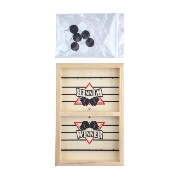 Jogo de hóquei de mesa rápido em madeira que inclui 10 peças redondas (5 brancas e 5 pretas) e manual. Reforça a marca enquanto proporciona entretenimento.