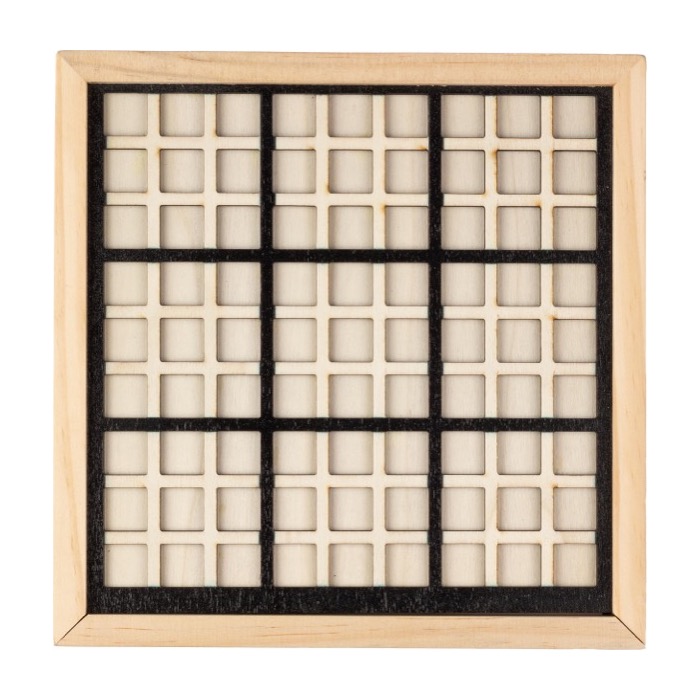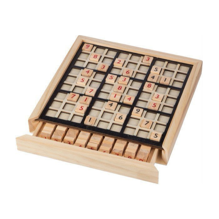 Jogo de Sudoku de madeira. Inclui 99 fragmentos de madeira numeradas e um manual de instruções e soluções de reprodução. Embalado individualmente em uma caixa de papelão marrom.
