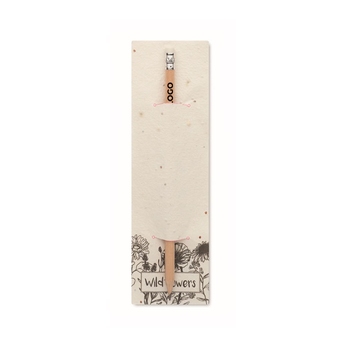 Um lápis de madeira natural com borracha. Vem apresentado em papel de semente com flores silvestres, podendo ser um merchandising corporativo atrativo.