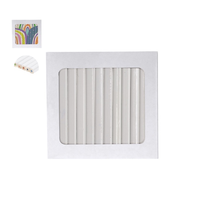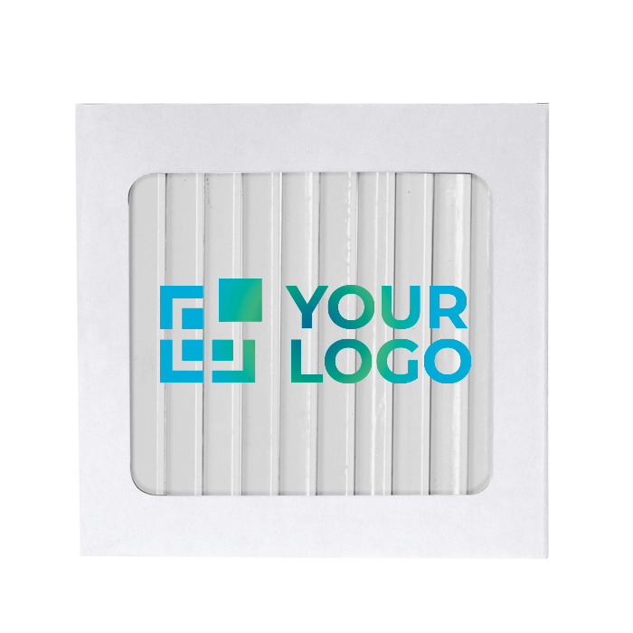 Lápis de madeira com acabamento branco e corpo hexagonal entregues numa caixa de cartão com fecho de aba. Incluem minas em várias cores para abranger os usos habituais no escritório, formação ou atividades criativas. O design do corpo foi pensado para impressão digital, o que facilita a personalização nítida com logo, nome do evento ou mensagem interna. O estojo mantém o conjunto ordenado e pronto a entregar. Recomendados para ações de marca em feiras, academias ou campanhas de boas-vindas.
