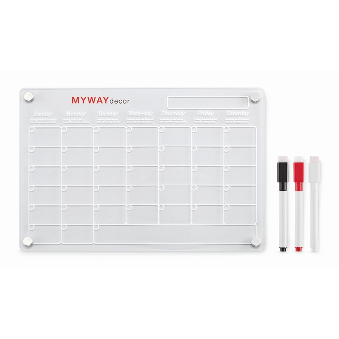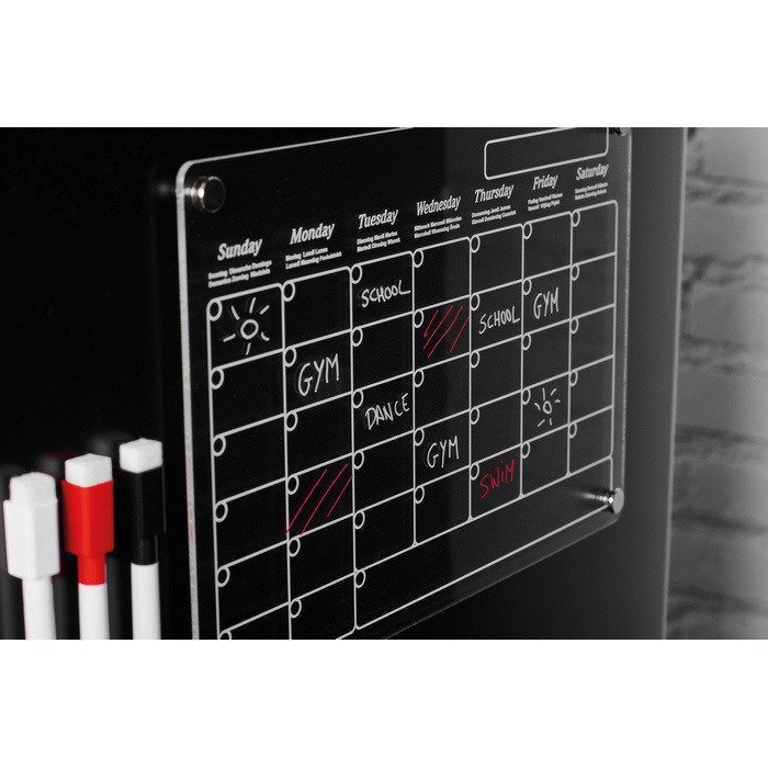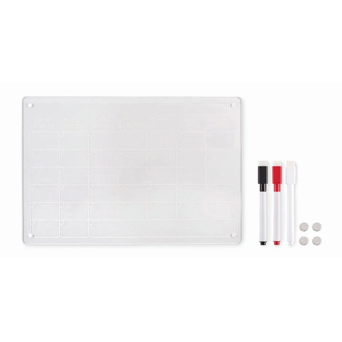 Agenda mensal de acrílico magnético em formato A4, pensada para organizar tarefas e datas numa superfície visível. O quadro permite escrever e apagar facilmente graças aos 3 marcadores magnéticos apagáveis incluídos em preto, vermelho e branco. Instala-se de forma estável com os parafusos de montagem incluídos, ideal para salas de reuniões, receção ou zonas de trabalho partilhadas. Opção prática para planeamento interno, acompanhamento de projetos ou comunicação de turnos.