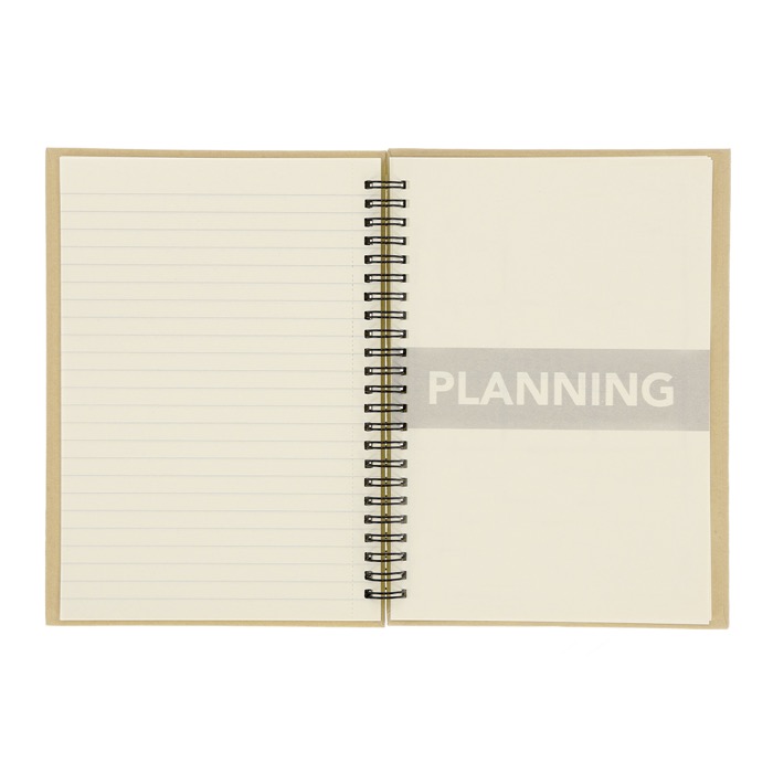 Caderno com planificador mensal incluído, de tamanho ligeiramente maior do que A5. Com capa dura de cartão reciclado. Inclui: 98 folhas de cor creme, pautadas e marca de corte fácil; 13 folhas planificadoras mensais sem datas, com vista de calendário mensal; 2 folhas pautadas adicionais para notas. Perfeito para planificar o seu mês, tirar apontamentos ou tomar notas e organizar o seu dia a dia.