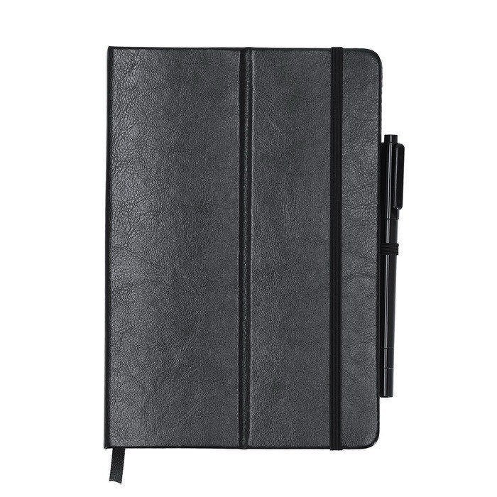 Caderno A5 de pele sintética reciclada com quadro na primeira página para esquemas, lembretes e mensagens rápidas. Inclui caneta-marcador de escrita preta e apagador, pensado para alternar entre papel e quadro sem trocar de ferramenta. Contém 80 folhas pautadas para apontamentos no dia a dia. A capa dobrável funciona como suporte para trabalhar na secretária ou balcão e a fita elástica mantém o fecho seguro. Recomendado para formação interna, feiras e uso no escritório.