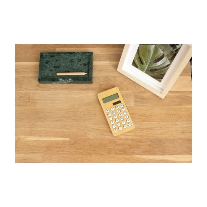 Calculadora em bambu e plástico com painel solar, pensada para o dia a dia em balcões e postos de trabalho. Mostra até 8 dígitos para cálculos rápidos e mantém uma leitura clara. Incorpora um pequeno jogo de labirinto de bolas na parte de trás, útil como detalhe diferenciador em ações de comunicação. Inclui pilha para ter apoio quando não há luz suficiente. É entregue em saco e caixa de apresentação, adequada para entregas em feiras, formações ou boas-vindas no escritório.