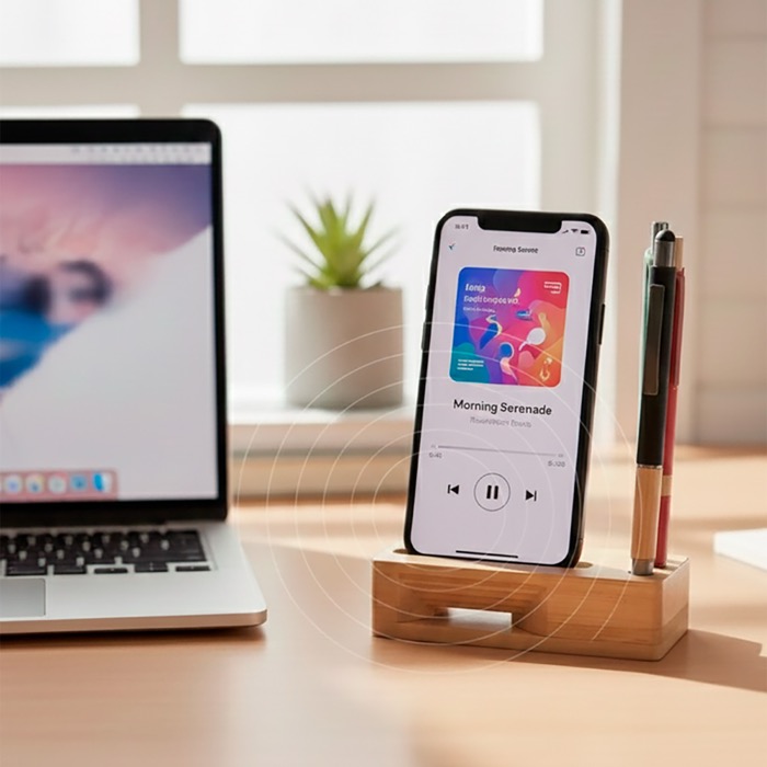 Suporte multifuncional em bambu natural com Certificação de Sustentabilidade Florestal, pensado para manter a secretária organizada sem complicações. Permite colocar o telemóvel de forma estável, deixando o ecrã à vista para videochamadas ou notificações. Inclui espaço para organizar canetas e pequenos acessórios e conta com um canal amplificador que melhora o som do dispositivo de forma natural, sem cabos nem energia. O design é minimalista e discreto, fácil de integrar em escritório ou em zona de estudo. Útil para ações de boas-vindas, eventos internos ou merchandising empresarial.