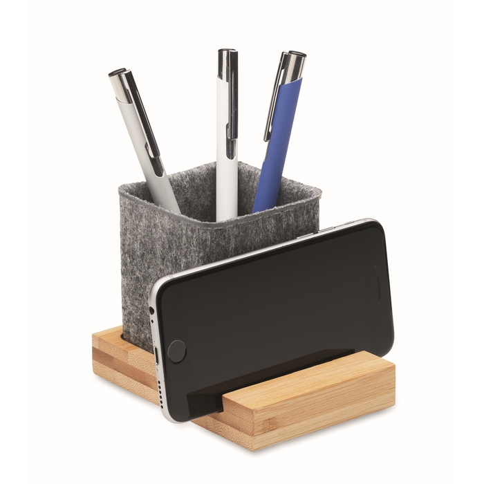 Porta-canetas de feltro RPET com base de bambu e suporte para telefone.