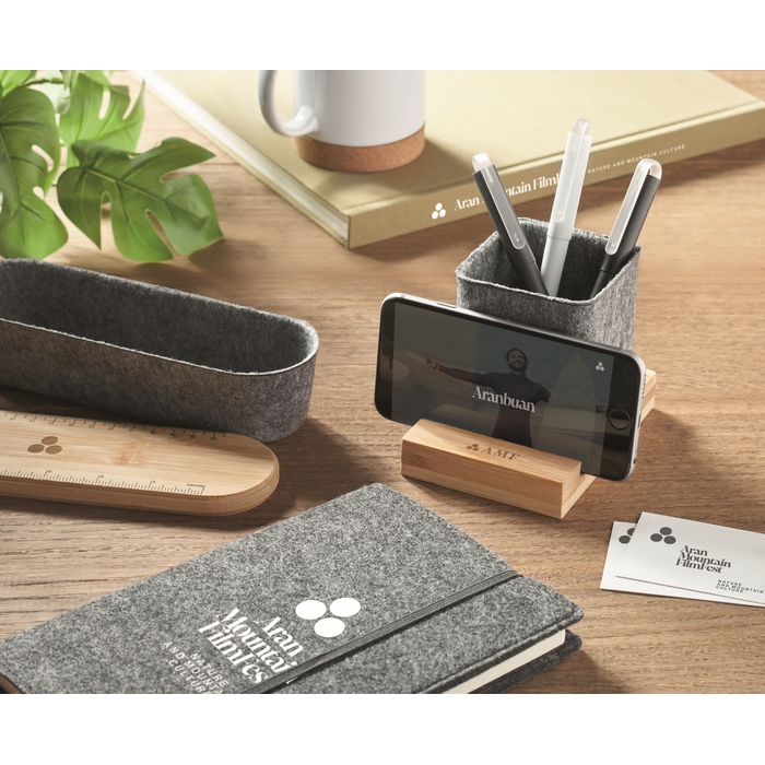 Porta-canetas de feltro RPET, base de bambu e suporte para o telemóvel