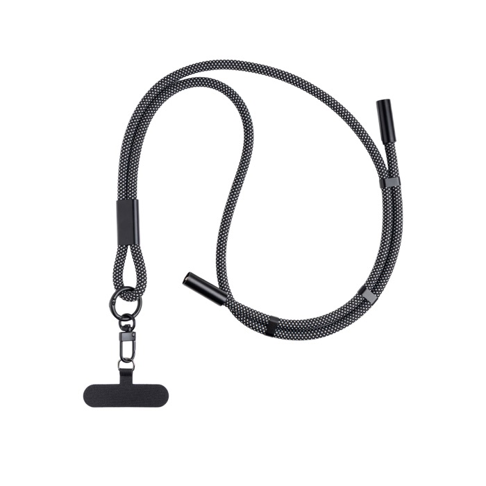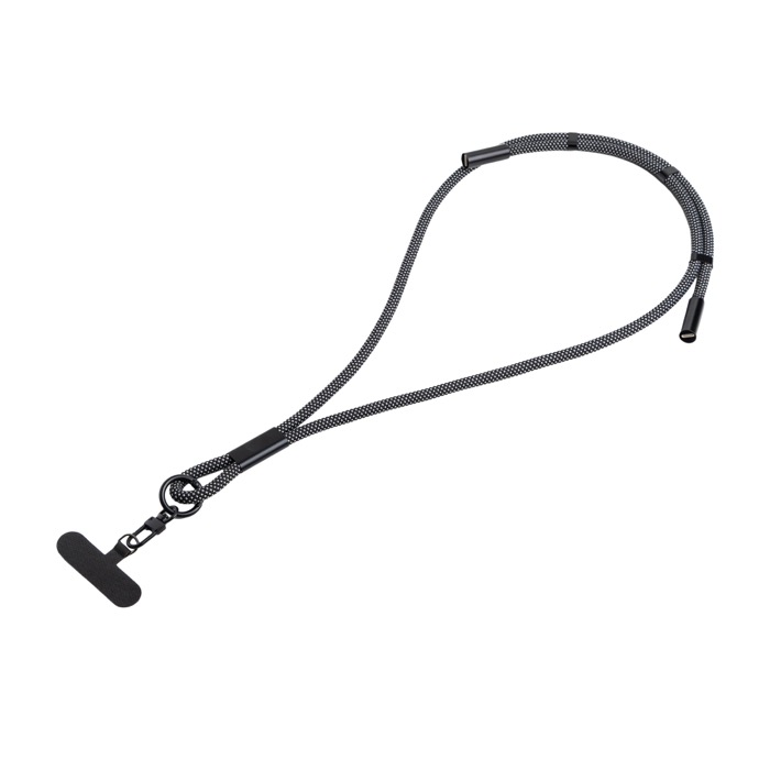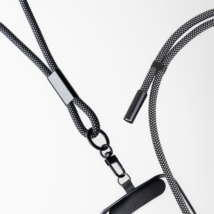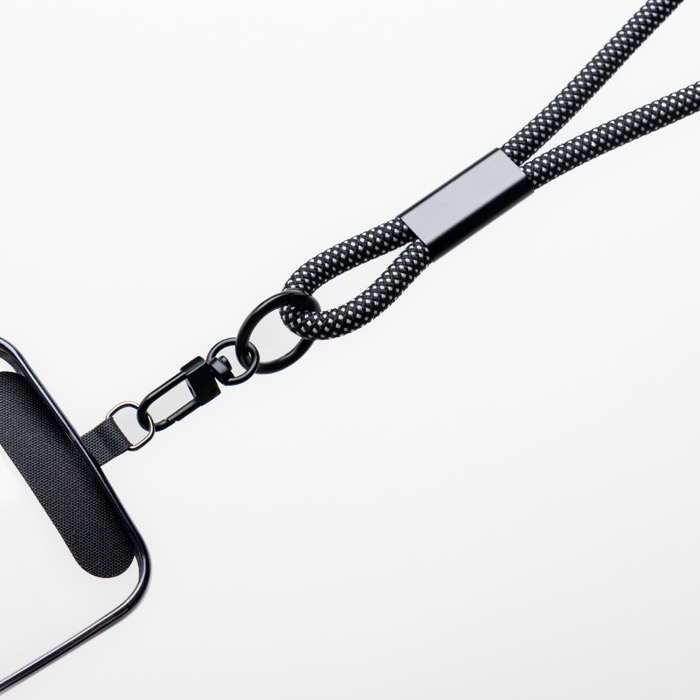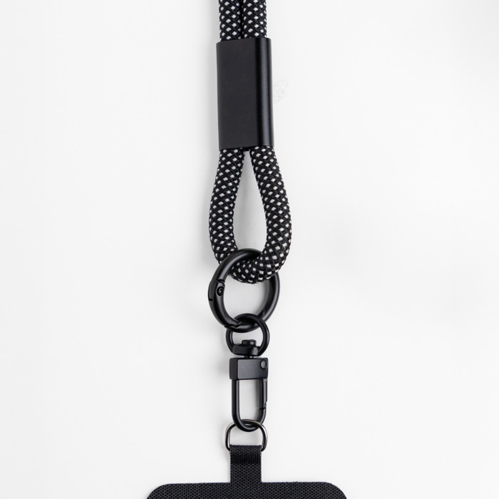 Com tecnologia de carga rápida (2 USB-C), combina resistência e funcionalidade de PVC, nylon e detalhes metálicos. Desenhado como um lanyard para o pescoço de 104 cm, com tecido robusto em preto e branco e três presilhas ajustáveis que asseguram firmeza e suportam o peso do dispositivo sem ceder. Ideal para quem procura praticidade e conforto ao permitir ter tudo ao seu alcance, mesmo com as mãos livres.