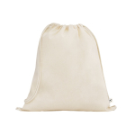 Saco tipo mochila 100% algodão orgânico (140 g/m²) com alças de algodão para fechar.