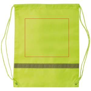 Mochila de poliéster com banda refletora e cordões ajustáveis. Possibilidades de marcação em impressão a uma tinta com serigrafia ou multicor com transfer.