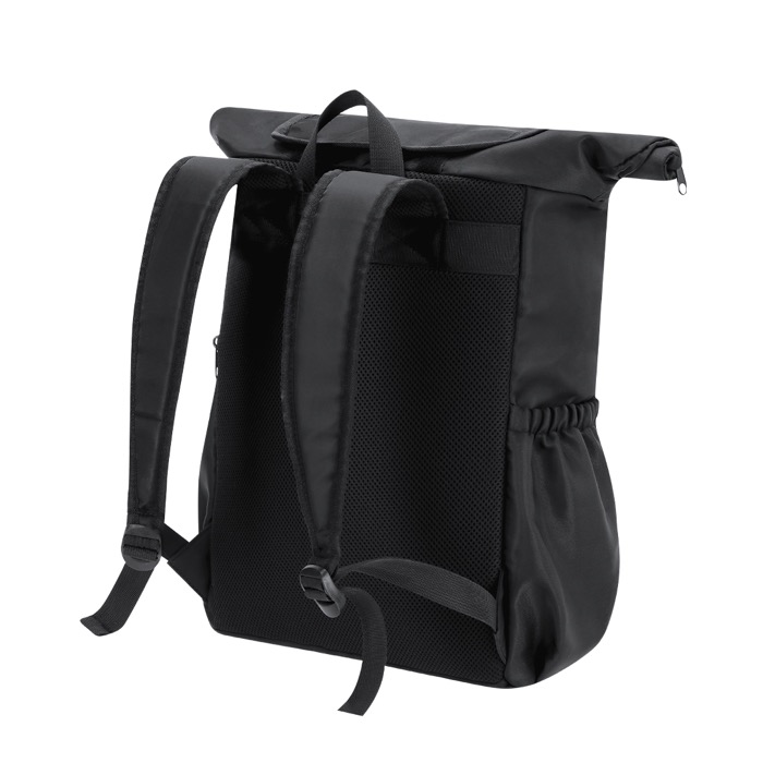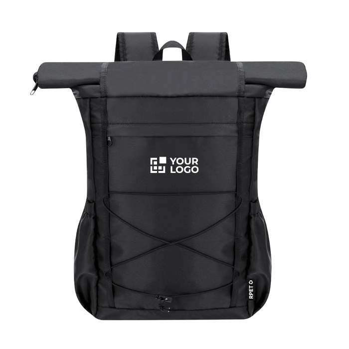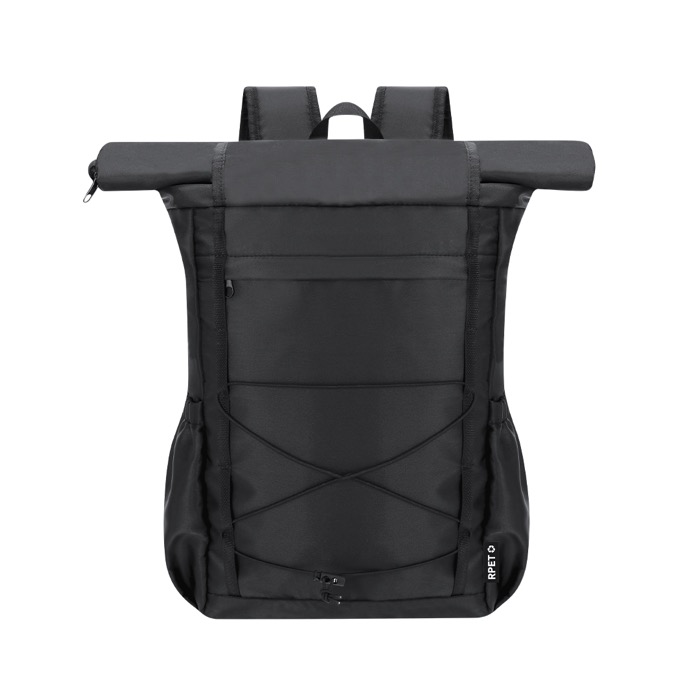 Mochila de poliéster reciclado 290D com fecho enrolável, fecho de correr e um outro fecho de velcro para manter o conteúdo no lugar. Inclui bolso frontal com fecho de correr invisível e cordão elástico ajustável para fixar a um casaco ou acessórios. Dispõe de dois bolsos laterais para garrafas ou artigos de acesso rápido. O interior proporciona grande capacidade e contém compartimento acolchoado para portátil até 15 polegadas, com costas e alças acolchoadas para uso diário. Recomendada para ações de boas-vindas, feiras ou dotação interna com logo.