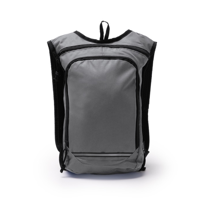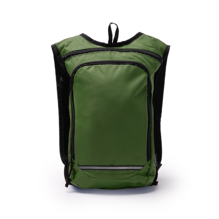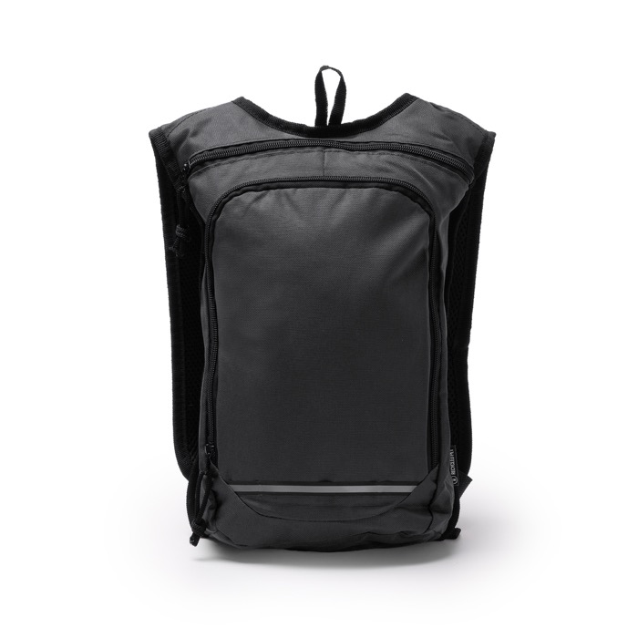 Mochila de plástico reciclado 600D pensada para uso diário em ambientes de trabalho, eventos ou deslocações. Inclui um compartimento principal com fecho de correr superior e duas aberturas para mangueiras de bebidas, útil para atividades ao ar livre ou percursos. Acrescenta um bolso frontal exterior de grande capacidade, também com fecho de correr, para organizar documentação e acessórios. Os puxadores pretos conferem um acabamento uniforme. Inclui uma faixa refletora horizontal para melhorar a visibilidade, com alças e costas acolchoadas. Opção prática para ações de marca e equipamento de equipas.