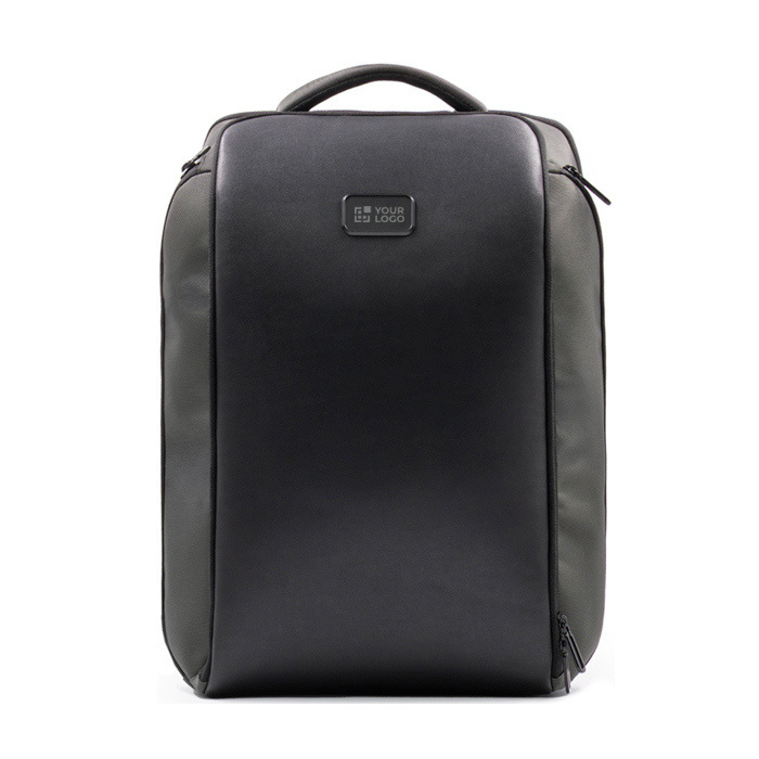 Mochila de tecido balístico reciclado 800D, repelente à água e às manchas, com detalhes de pele sintética e aspecto desenhado para o dia a dia. Oferece 22 000 ml de capacidade e compartimento acolchoado para portátil até 16 polegadas, além de compartimento traseiro antirroubo para levar o importante mais protegido. Inclui espaço para óculos, dois bolsos laterais, fole para organizar melhor e manga para trolley. O respaldo com acolchoado ventilado melhora o conforto em percursos longos. Útil para ações de marca, onboarding ou eventos corporativos.