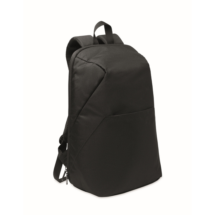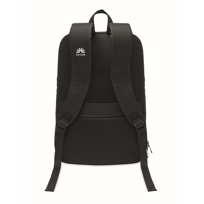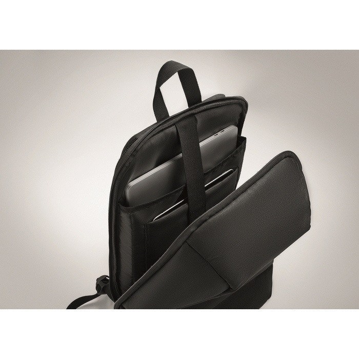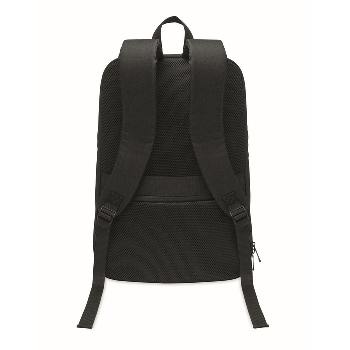 Mochila antirroubo para portátil de 15'', poliéster rPET 600D. Dispõe de vários compartimentos, incluindo um adicional acolchoado para tablet, entre outros. Alças acolchoadas e compartimento principal no verso.
