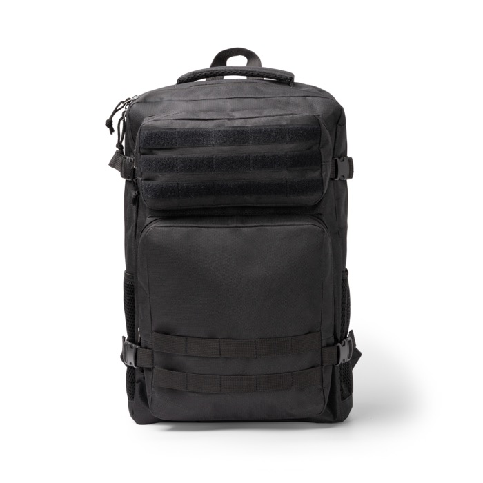 Mochila desportiva em plástico reciclado 600D, pensada para o dia a dia e para deslocações com material de trabalho. Inclui vários bolsos frontais, em diferentes tamanhos, para organizar acessórios e documentação sem perder tempo. O compartimento principal abre totalmente para facilitar o acesso e acrescenta um espaço específico para portátil até 17''. Inclui fitas laterais de ajuste, bolsos de rede para garrafas e pontos de ancoragem para fixar objetos extra. Costas e alças acolchoadas para um transporte confortável. Útil para ações de marca em feiras, equipa comercial ou onboarding.