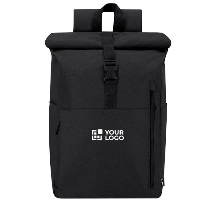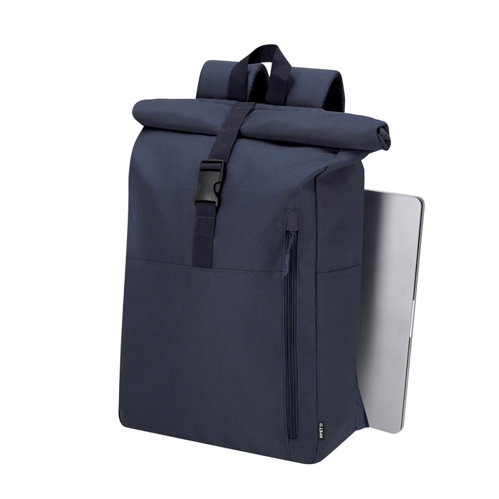 Mochila feita de rPET 300D resistente. Com sistema de fecho enrolável e fivela. Dispõe de dois bolsos frontais, um bolso traseiro com acesso lateral e dois bolsos laterais adicionais. Interior de grande capacidade com compartimento acolchoado para portátil até 15 polegadas. Alça de ombro e costas acolchoadas. Inclui manga de transporte para fixar o trolley ou maleta, ótima para viagens e deslocações.