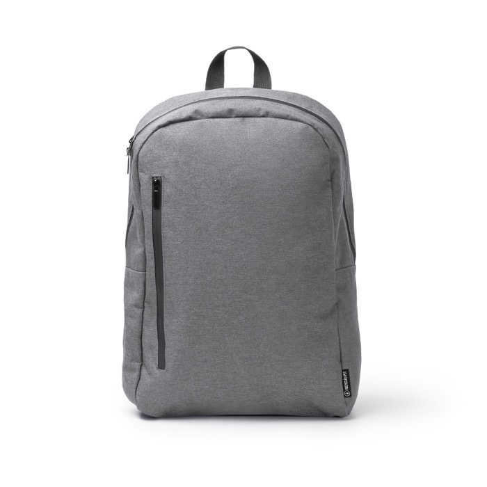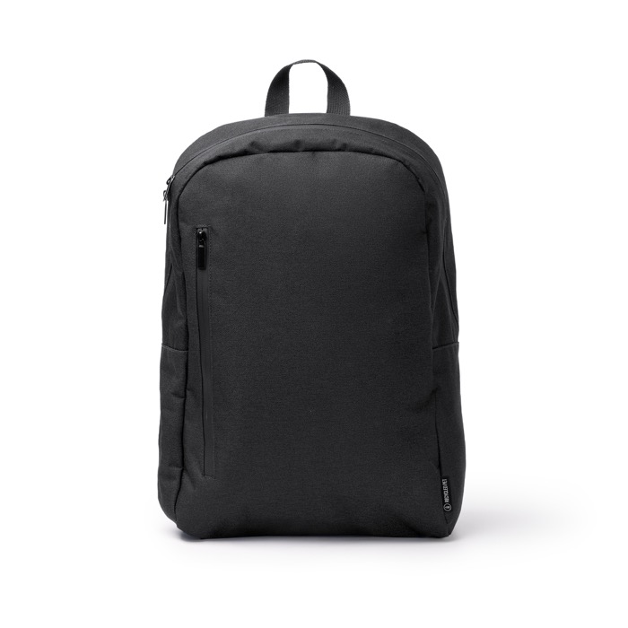Mochila de plástico reciclado com tecido 300D e revestimento em plástico que ajuda a repelir líquidos. Incorpora fechos impermeáveis e um compartimento principal com fecho duplo para organizar o dia a dia. Inclui bolso interior para portátil até 15'' e dois bolsos extra para acessórios, além de um bolso exterior amplo com fecho hermético. Acrescenta laterais para garrafas, costas e alças acolchoadas, fita refletora e banda para trolley. Útil para ações de marca em feiras, onboarding ou viagens empresariais.