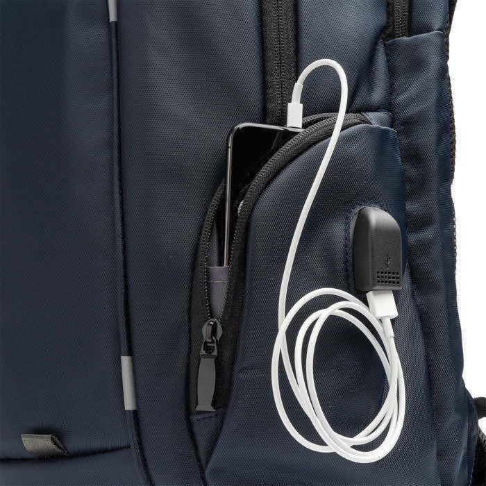 Mochila com espaço acolchoado para portátil e saída USB, desenhada para facilitar as viagens diárias e manter os dispositivos sempre carregados e protegidos.