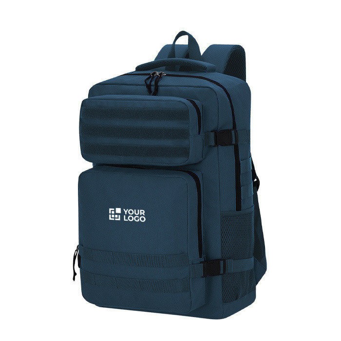 Mochila de poliéster resistente 600D com design pensado para o dia a dia e deslocações. Parte frontal com vários bolsos para organizar acessórios, mais suportes elásticos e velcro para levar elementos à mão. Compartimento principal com fecho de correr de puxador duplo e espaço para portátil de 17". Inclui pega, costas e alças acolchoadas e ajustáveis, manga para trolley e bolsos laterais de rede. Opção prática para ações de marca em feiras, formações ou uso no escritório.