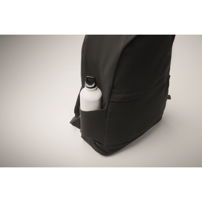 Mochila para portátil de 15 '' em algodão pré-consumo reciclado e poliéster reciclado (70%/30%). Tem um bolso frontal com fecho de correr e um bolso com fecho de correr na parte de trás. Alças de ombro e costas almofadadas e macias. Suporte para trolley na parte de atras.
