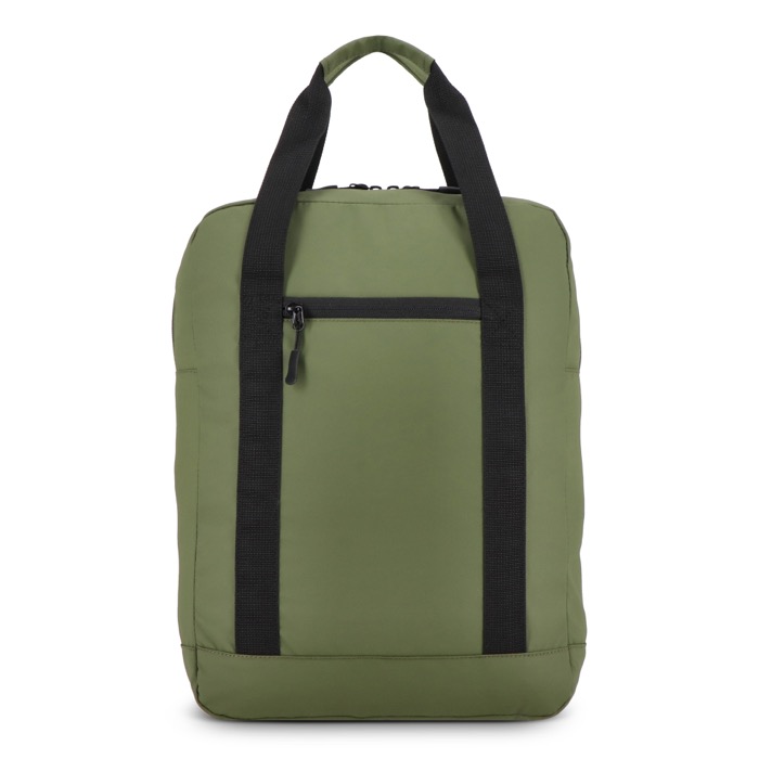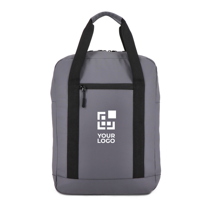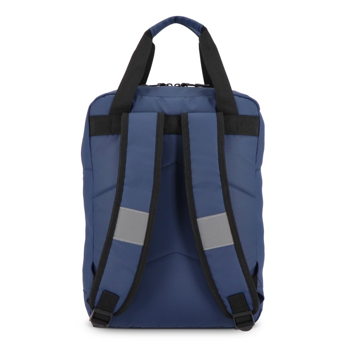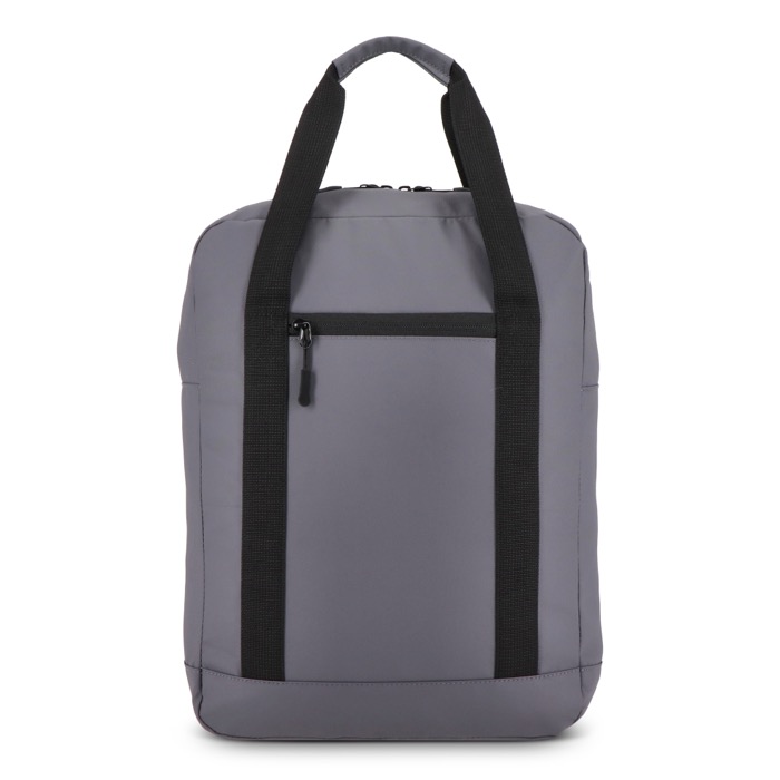 Mochila de plástico reciclado 600D com um formato muito utilizado no dia a dia no escritório e deslocações. Dispõe de alças de ombro ajustáveis com faixas refletoras para melhorar a visibilidade, além de costas acolchoadas para um transporte mais confortável. Dispõe de duas asas superiores para a mover rapidamente e bolso frontal com fecho de correr para acessórios. Contém um compartimento acolchoado para portátil até 15,6''. Recomendada para ações de boas-vindas, eventos e uso corporativo com logótipo.