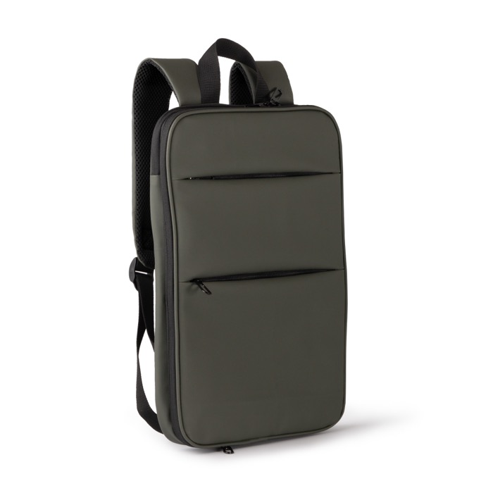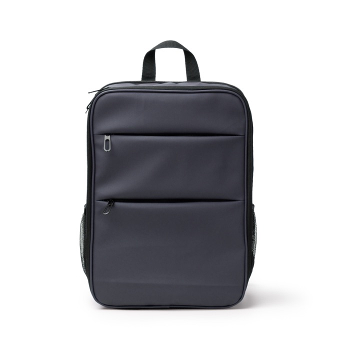 Mochila em pele sintética com dois compartimentos principais e fechos de correr duplos para um acesso rápido. Inclui um espaço almofadado para portátil até 15'' e um segundo compartimento extensível com bolso de ajuste elástico, pensado para transportar outros dispositivos. No exterior, incorpora dois bolsos frontais com fecho de correr e dois bolsos laterais em rede elástica para garrafas ou bidões. Alças e costas almofadadas para uma utilização confortável em deslocações. Adequada para ações de marca no escritório e em eventos.