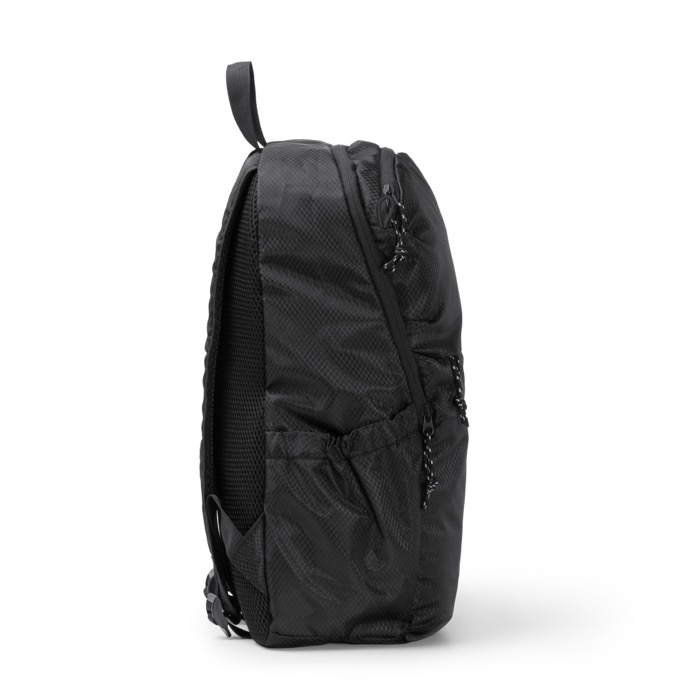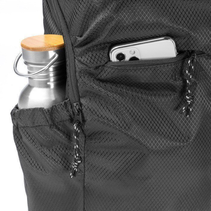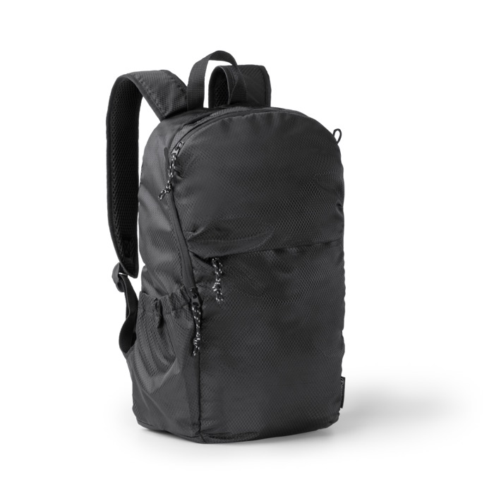 Mochila em plástico reciclado tipo Ripstop, com tecido repelente à água para o uso diário em movimento. Inclui compartimento principal com fecho de correr e bolso interior com ajuste elástico para transportar dispositivos eletrónicos até 9''. Acrescenta dois bolsos frontais exteriores com fecho de correr para organizar cabos, chaves ou documentação. Na lateral, inclui um compartimento elástico para garrafas ou cantis. Alças e costas almofadadas para um transporte mais confortável. Útil para ações de RH, eventos e equipas comerciais.