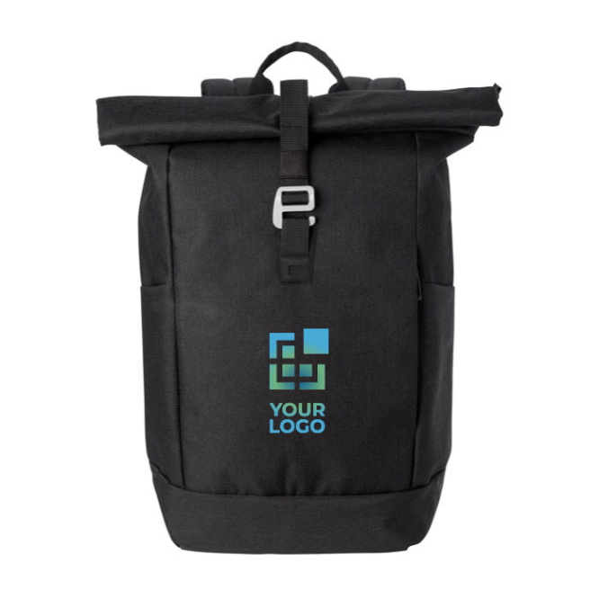 Mochila de enrolar em poliéster (600D). Um grande compartimento com fecho de correr com dois bolsos e um compartimento para computador portátil. Outro compartimento com fecho na parte da frente. Gancho metálico para o fechar. Costas e alças alcochoadas.