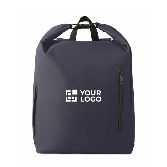 Mochila roll-top de poliéster rPET 600D com forro acolchoado rPET 210D, projetada para transportar portátil até 15 polegadas e acessórios de trabalho. Inclui bolso frontal com fecho de correr para organizar cabos, carregador ou documentação, além de um bolso lateral elástico para garrafa ou guarda-chuva. As alças de ombro reguláveis permitem um ajuste confortável durante deslocações diárias. Opção prática para dotações internas, packs de boas-vindas ou ações de merchandising corporativo.