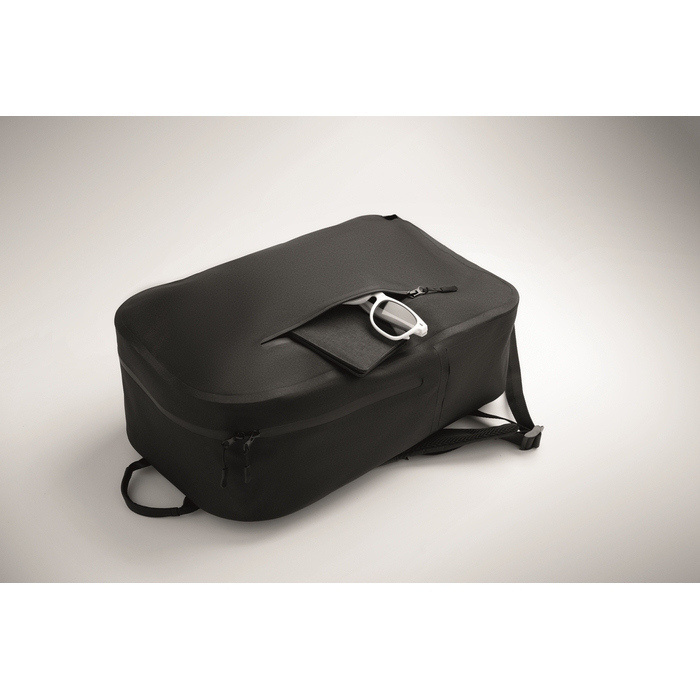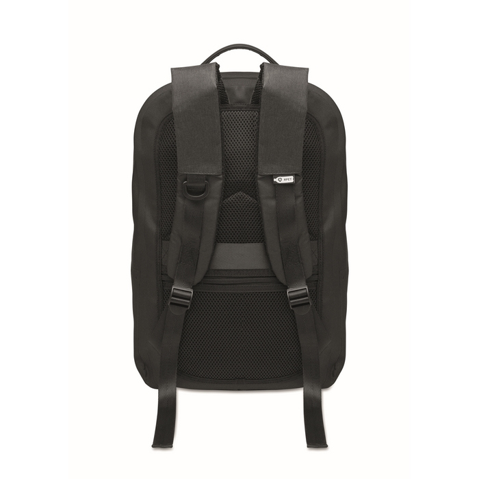 Mochila para portátil de 16'' de poliéster rPET 300D e forro de poliéster 210D. Tecido resistente à água. Bolso oculto com fecho de correr e manga para trolley. Compartimento interior acolchoado para portátil, verso de rede e alça de ombro.